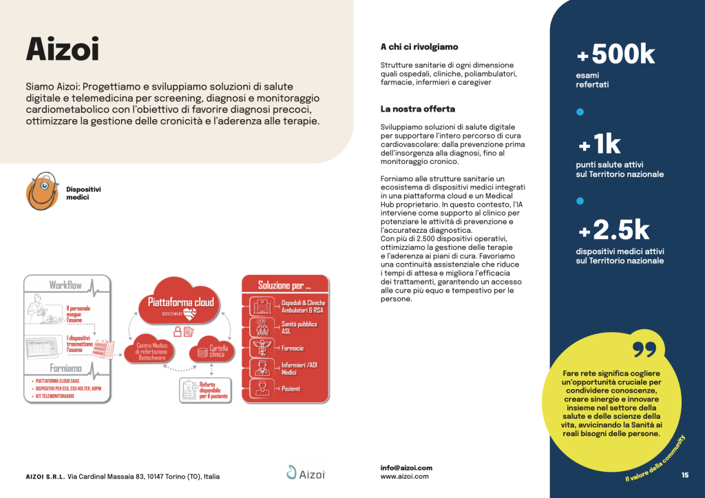 La missione di Aizoi è quella di sviluppare e distribuire soluzioni tecnologiche per il mercato della telemedicina, in Italia, Europa e America, a partire da una nuova soluzione per la registrazione degli elettrocardiogrammi. L’offerta di Aizoi è rivolta ai professionisti interessati a offrire un servizio ECG professionale (farmacie, cliniche, medici di medicina generale, centri sportivi, ecc). L’offerta è particolarmente convincente per le farmacie che sentono il forte bisogno di differenziarsi dalle nuove forme di concorrenza che stanno entrando nel mercato e di aumentare le proprie fonti di reddito attraverso la fornitura di nuovi servizi.